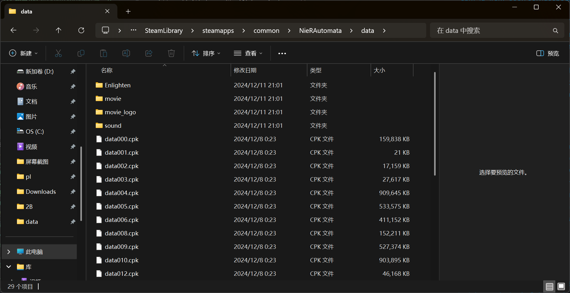 找到你的游戏目录下的NieRAutomata\data,这里存放着游戏的所有资产的CPK,CPK相当于一个压缩包