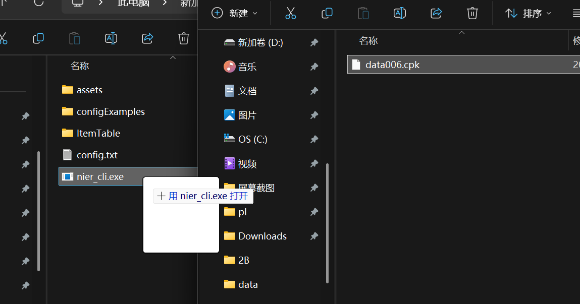下载工具nier_cli,这个工具可以用来解压CPK文件,操作很简单,将CPK文件拖入程序文件nier_cli.exe即可