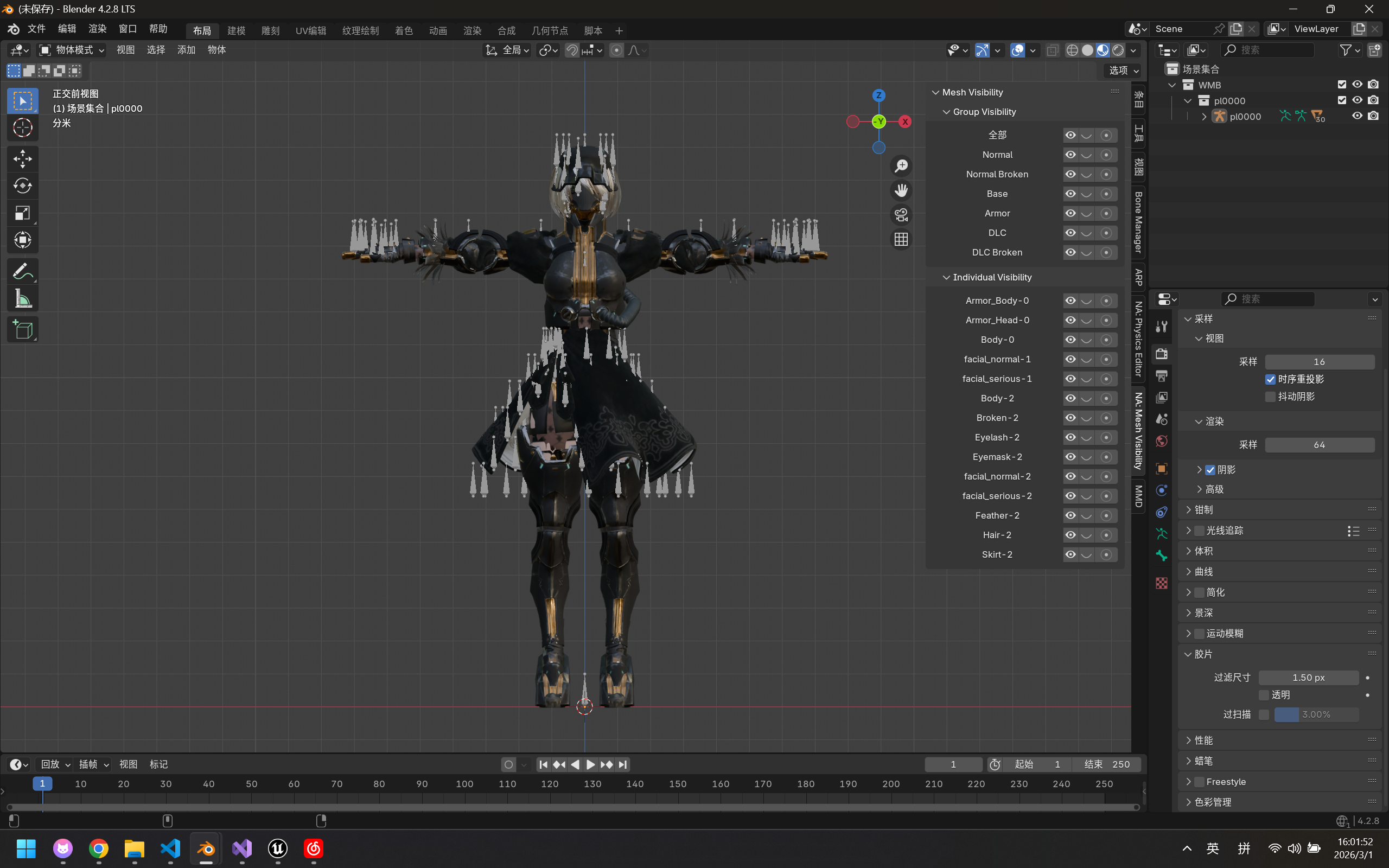 虽然Noesis也可以导出人物模型,但有两个Bug,其一是模型导入时会缩小100倍,这很好解决,在导入时放大100倍即可,其二时模型导入Blender后会出现经典的贴图错误,全身发紫