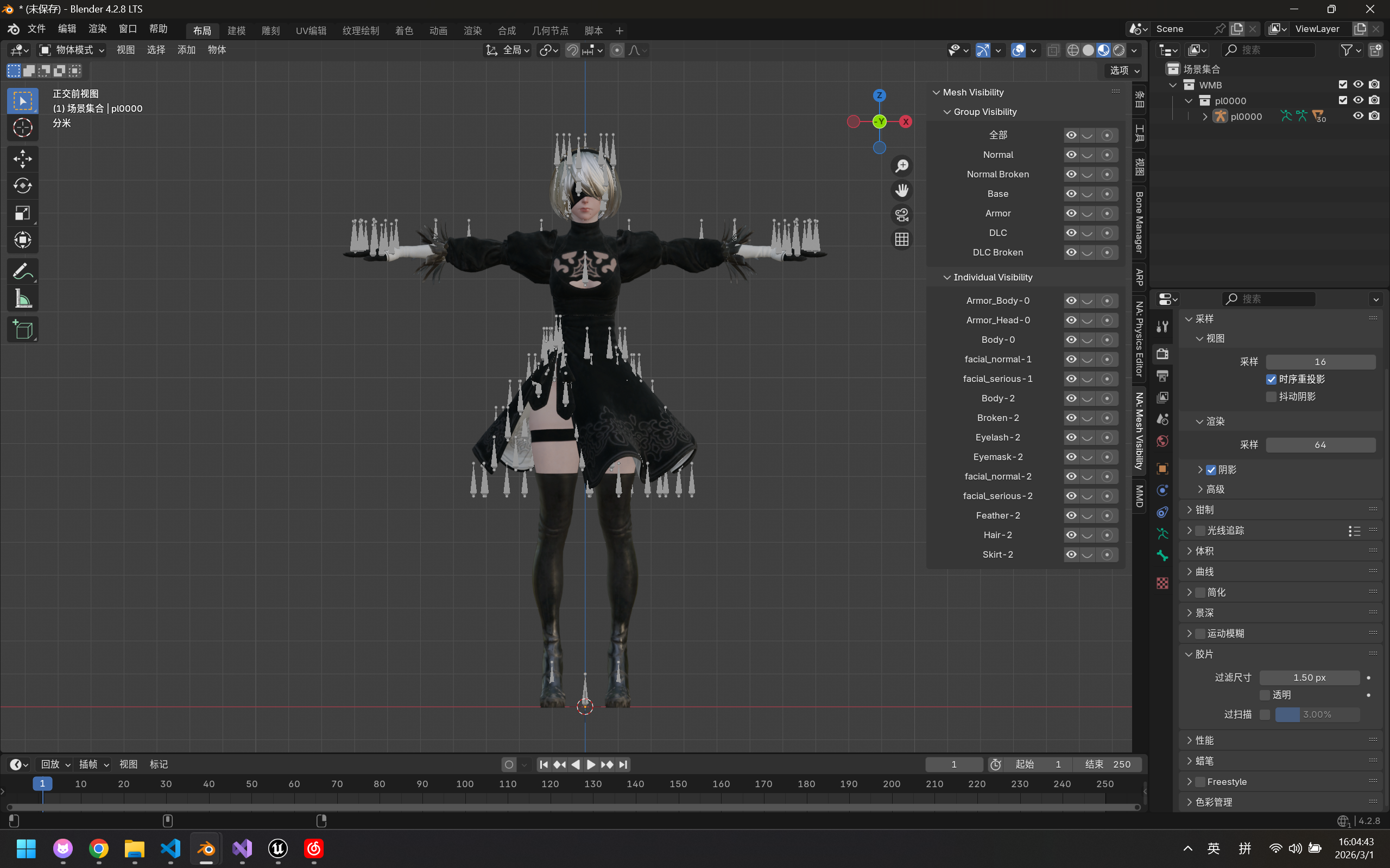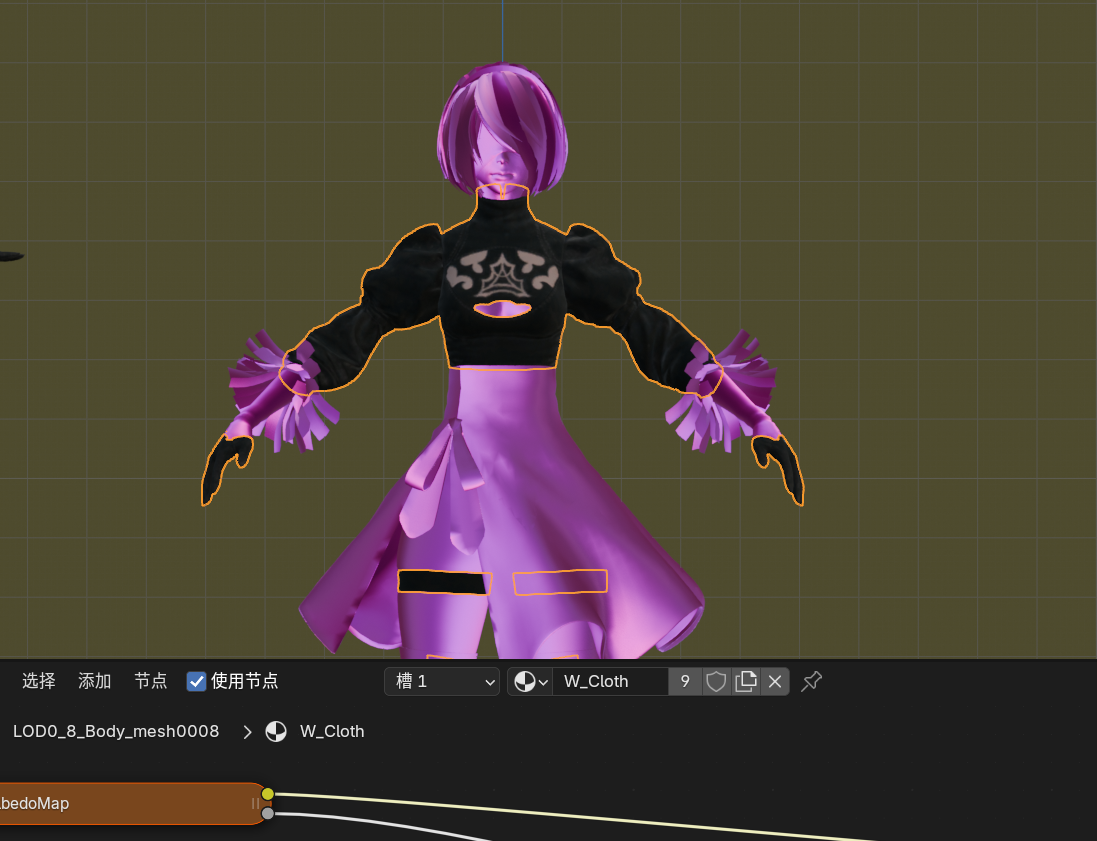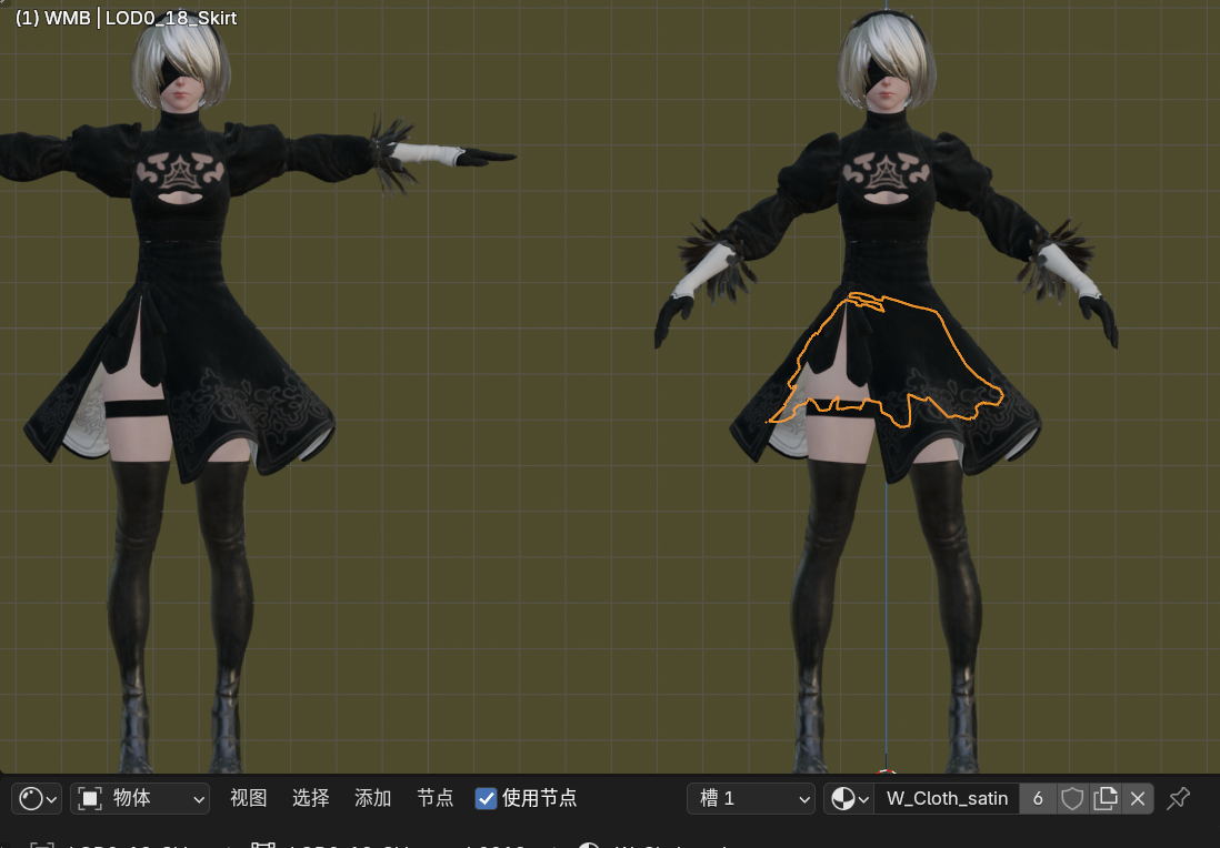 使用插件NieR2Blender2NieR可以快速导入.wmb模型文件并自动将.wtp纹理材质与模型匹配