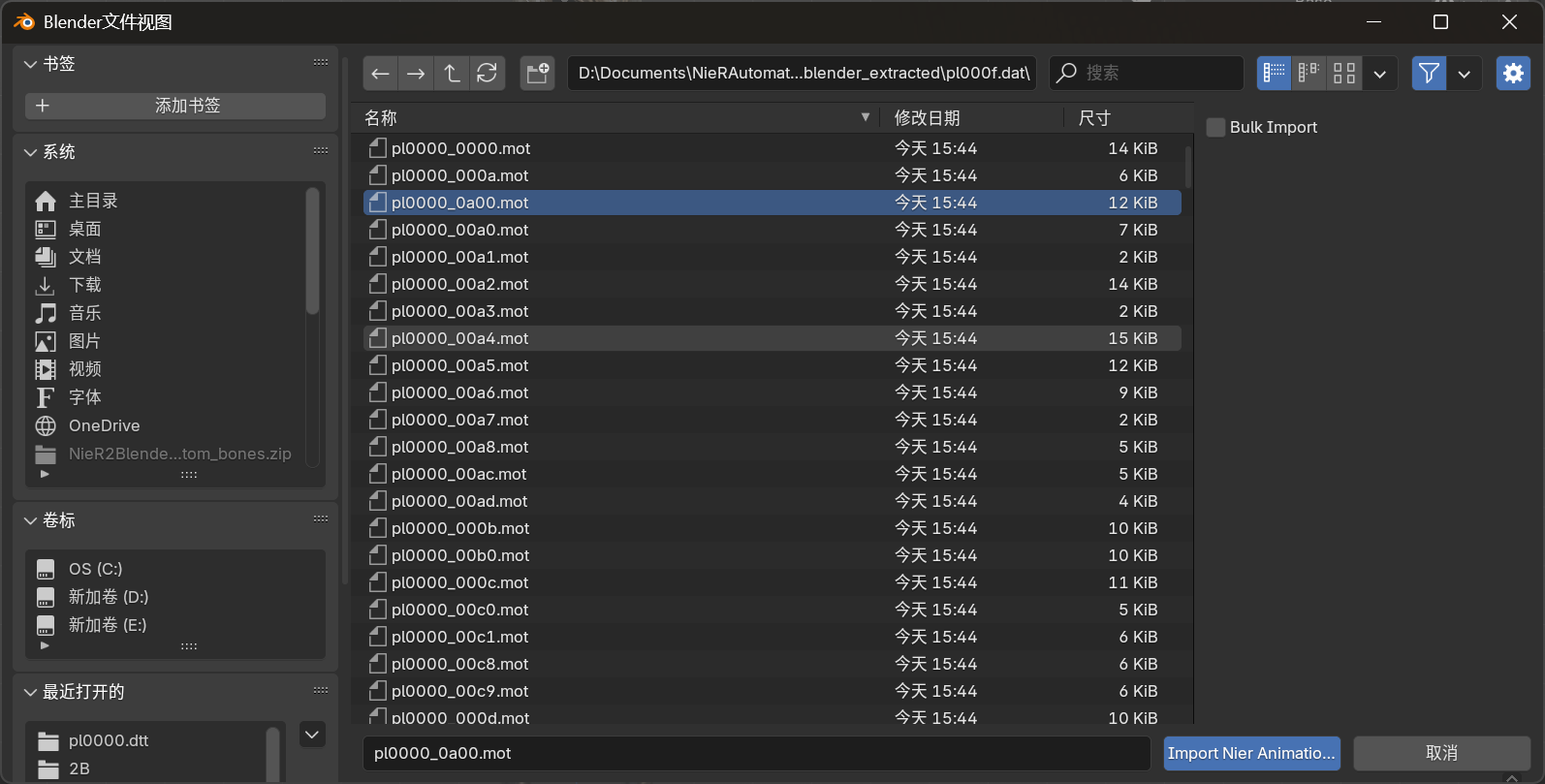 其中2B的动画文件存于pl000f.dat,目测下来有几百个,如果你想一个一个看也可以,NieR2Blender2NieR插件可以导入.mot文件,但这很难找到你需要的动画,当然你可以使用插件的全部导出选项,单击BulkImport复选框即可,但这会导致一个问题