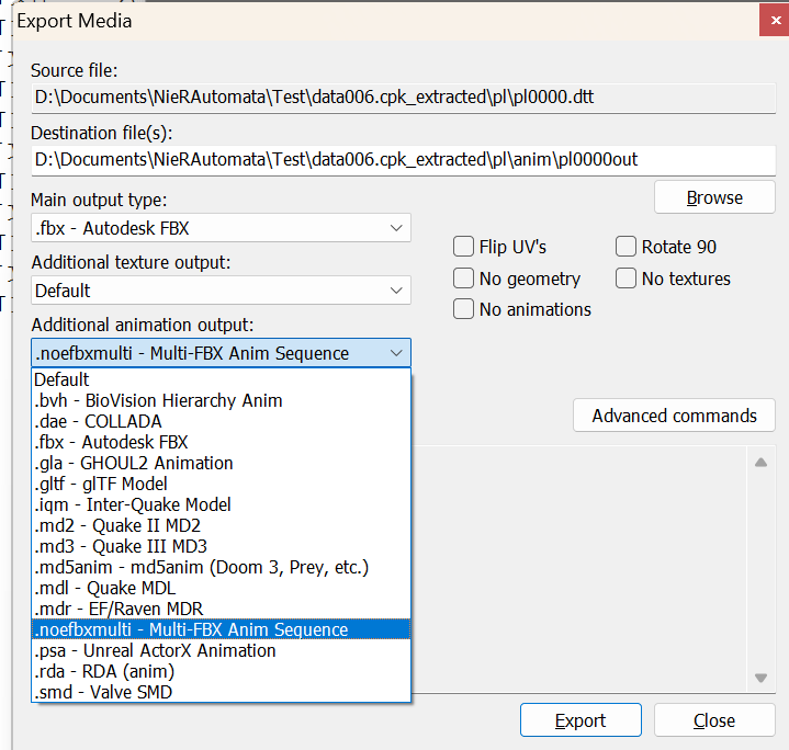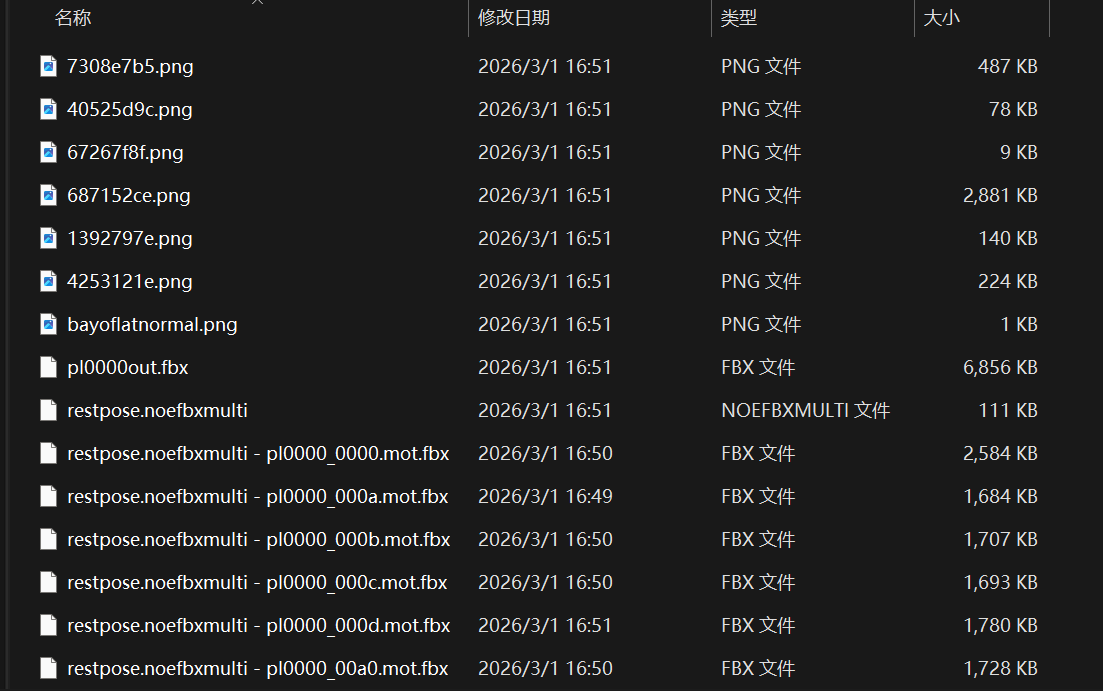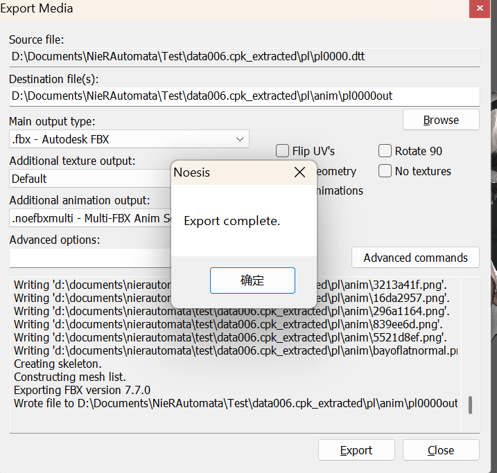 单击Export后,又会弹出对话框问你动作文件,老样子点击OK后选择pl000f.dat,在对话框第二次问你时点击取消,这样Noesis就会开始批量导出所有动画为FBX动画