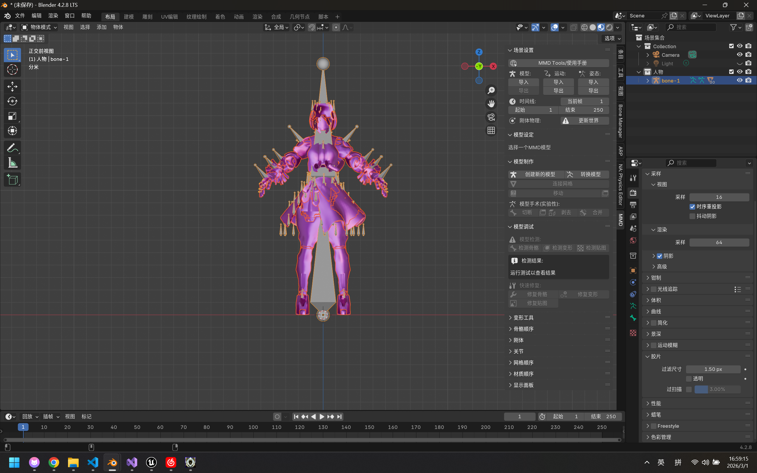 重启blender工程文件,可以发现当前角色模型贴图呈现错误的紫色,这是因为我们更改了图片的类型,而blender所链接的贴图文件名还没更改