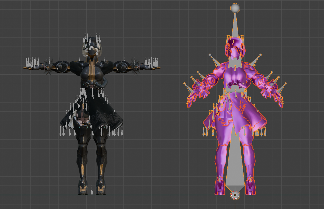 - 隐藏骨骼、战甲方便操作,进入着色视图开始着色,我们要利用.wmb模型已经贴好的贴图替换掉.fbx的贴图