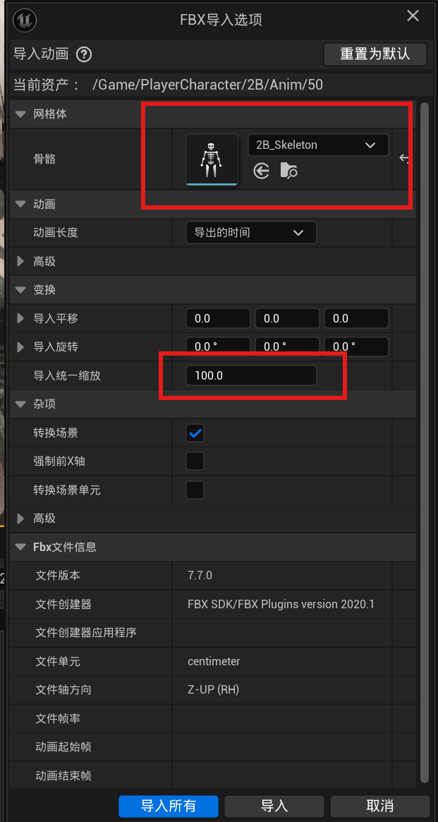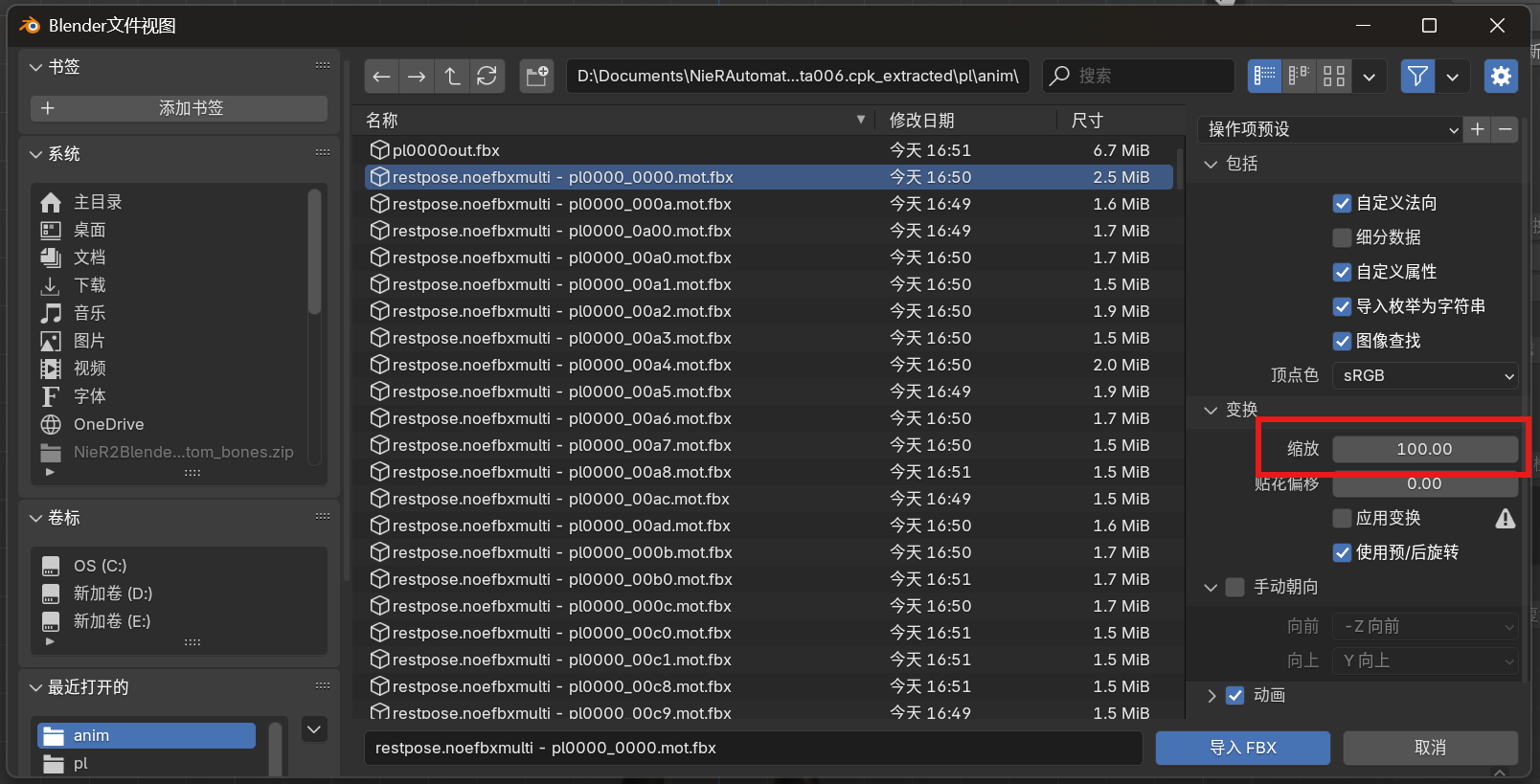 导入动画的FBX文件(可以批量导入,很慢,记得调整缩放100倍)