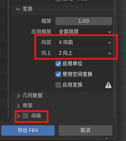 导出时有两个设置要改,一个是由于unreal以x为正方向,所以需要将朝向改为x向前z向上,还有就是关闭动画选项
