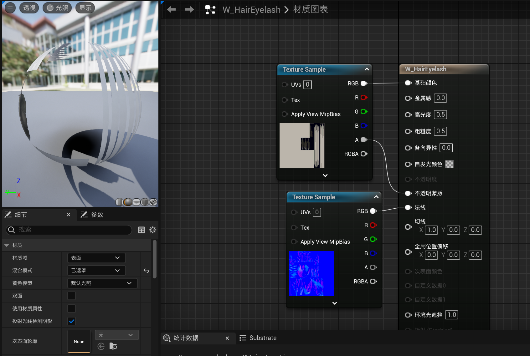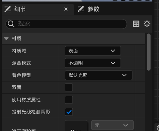 在细节面板上我们可以注意到混合模式默认为不透明,这导致我们无法使用透明通道,将其修改为已遮罩就可以解决该问题