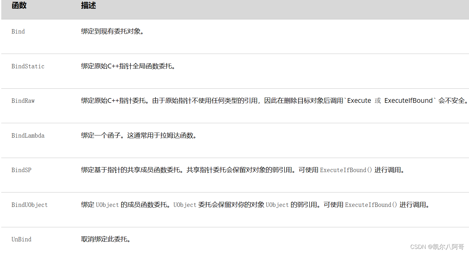 其中ObjectPointer为被委托函数的对象的指针&ClassName::FunctionName:为目标函数的成员指针。必须包含类名空间(例如 &AMyActor::MyHandler)