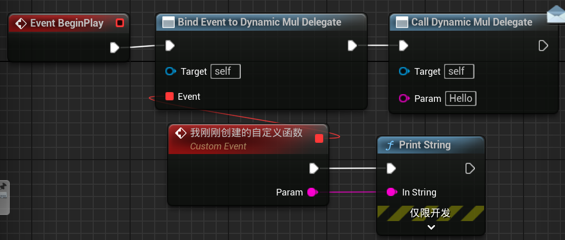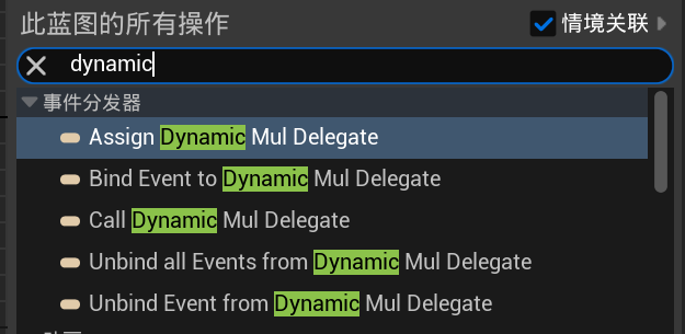动态多播最大的特点就是可以在蓝图中使用Bind或Assign节点绑定事件,使用Unbind节点解绑事件,当然,被绑定事件也需要有和委托定义时一样的形参